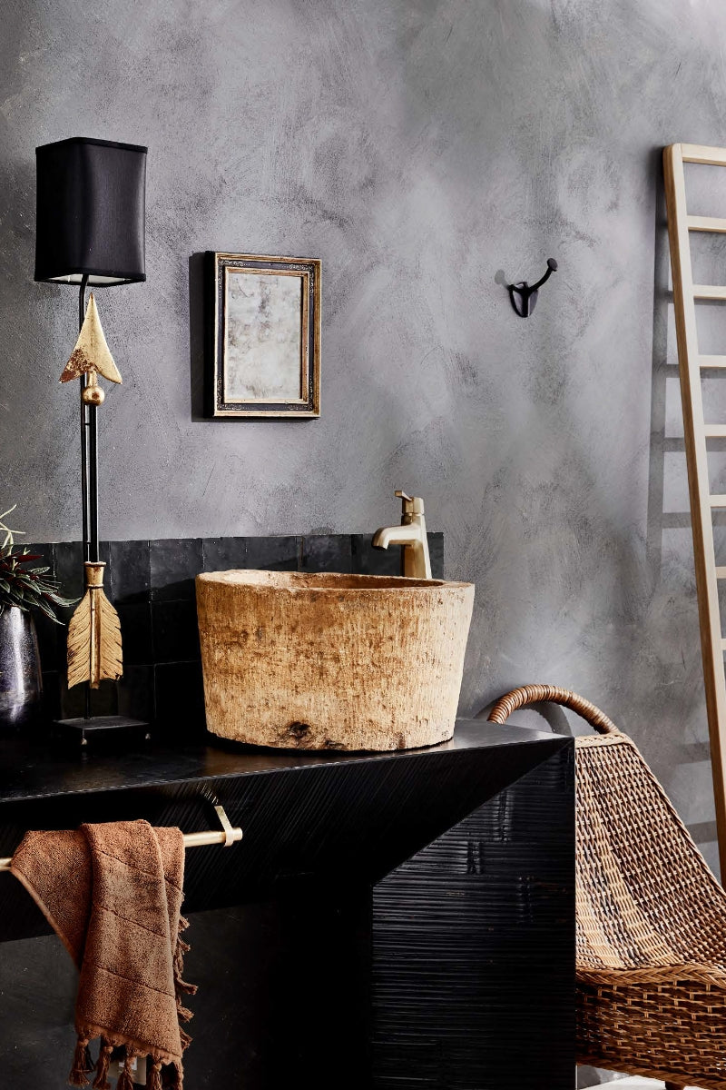 Cartenza bamboo console (used as vanity), Coco Republic. 1950s French rattan mermaid chair, Tamsin Johnson. Karl oak towel rail, Provincial Home Living. ON VANITY From left Peperomia in acid-finished footed bowl, Mandalay Flowers. Antique Gilded Arrows table lamp,The Vault Sydney. Vintage Indian stone pot, Orient House. Perrin & Rowe ‘Deco Collection’ single-lever basin mixer,and Armac Martin ‘Arbar’ appliance pull (used as towel rail), both The English Tapware Company. Aura Home ‘Paros’ cotton hand towel,Sydney Design Agency. ON WALL Petite gilt mirror,The Vault Sydney. Shield wall hook,The Society Inc. Casa handmade tiles in Agate (100x100mm), POA, Onsite Supply+Design. Wall painted Stone Paint Coarse in Mineral, Porter’s Paints.