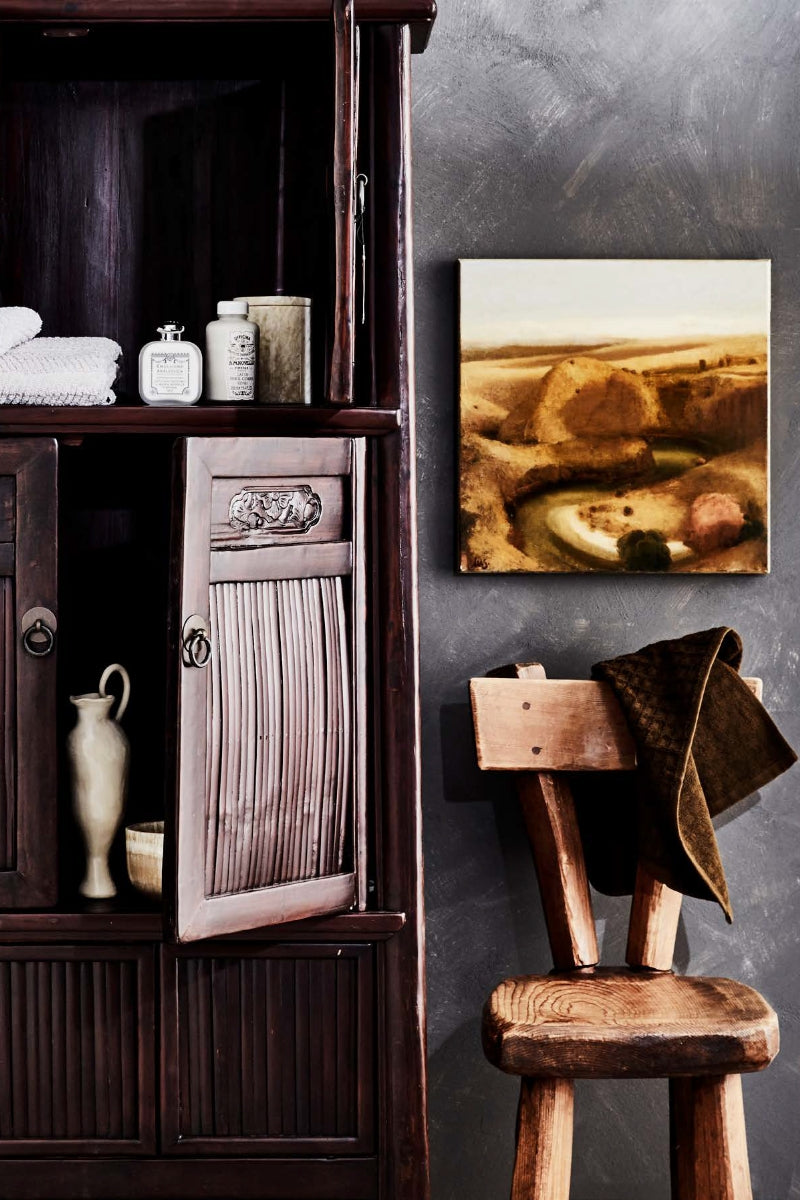 Antique Chinese cabinet, Orient House. Ouse River at Winchester painting by Stephen Lees, Wagner Contemporary. Aura Home Waffle cotton hand towel, Casa by Studio Kate. 1940s French work chair,Tamsin Johnson. IN CABINET, TOP SHELF From left Devon cotton hand towel in Pumice, and bath towel,Bed Bath N’Table. Santa Maria Novella alcohol-free aftershave emulsion(left), and body milk, both Casa by Studio Kate. Nevya onyx canister, Inartisan. BOTTOM SHELF Bird vase by Pip Woods, Casa by Studio Kate. Kala onyx bowl, Inartisan. Wall painted Stone Paint Coarse in Mineral, Porter’s Paints.