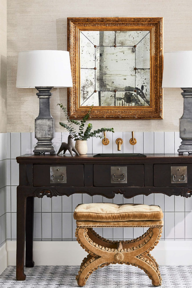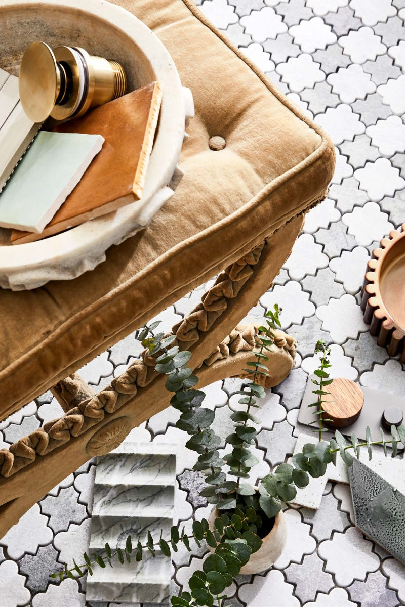 ABOVE X stool with velvet upholstery, The Vault Sydney. ON STOOL Scoop tile in Pale Putty (20x145mm), Zellij tile in Mint Gloss (100x100mm), and Casablanca tile in Honey Gloss (132x132mm), all Skheme. Pop-up bath waste in Brushed Brass PVD, Parisi. Indian marble bowl,Orient House.ON FLOOR From left Stone concave tile in Laurel (320x900mm), Skheme. Eucalyptus‘Baby Blue’ foliage from Mandalay Flowers in Asmara stone tumbler, Inartisan. Z tile, POA, and Diamond tile, POA, both Onsite Supply+Design. Elvire Progressive bath/shower mixer with diverter, Caroma. 1970s Italian dish, Becker Minty. Cairo Carrara and Peacock marble mosaic tiles,Teranova. OPPOSITE Antique Chinese table (used as vanity), Orient House.ON VANITY From left Zinc baluster lamps,The Vault Sydney. Minihorse sculpture by Athena Jahantigh , Becker Minty.ON WALL Mirror with distressed glass, Casa by Studio Kate. Grasscloth wallpaper in Aura, Porter’s Paints. Cementi wall tiles in Sage, Di Lorenzo Tiles. Perrin & Rowe ‘Contemporary’ basin set,The English Tapware Company.Tiling by Mustafa Tiler. All other items as before.