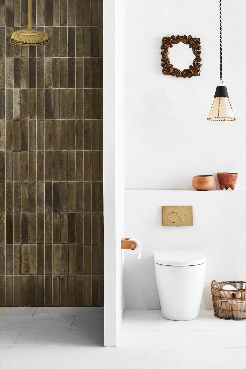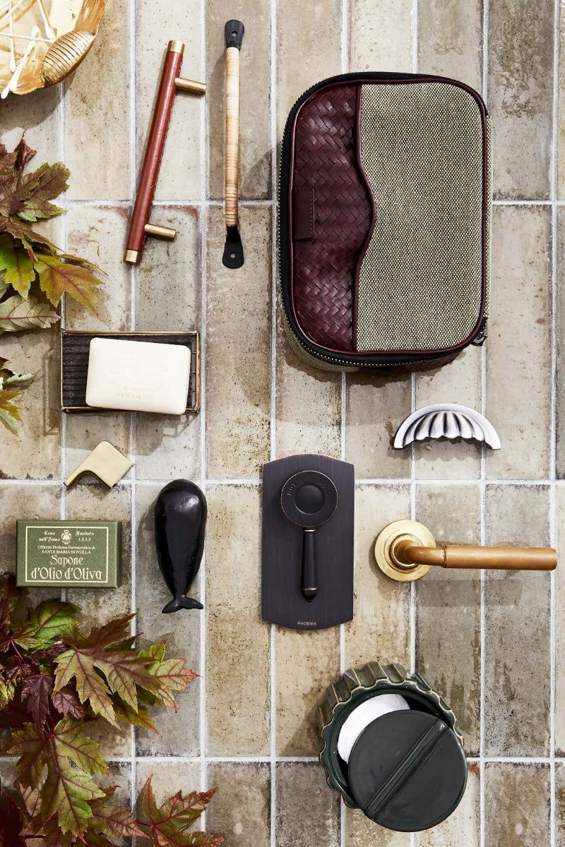 ABOVE Clockwise from top left Clam dish, Casa by Studio Kate. Joseph Thurloe cabinet handle, The English Tapware Company. Fleet cane-wrapped drawer pull,The Society Inc. Mantidy cotton and leather wash bag and manicure set, Becker Minty. Armac Martin ‘Aberdovey’ cup pull in Antique Silver, and Frank Allart ‘Fifth Avenue’ door lever in Rosette, both The English Tapware Company. Talma ceramic stash container, Casa by Studio Kate. Nostalgia shower/wall mixer in Black, Phoenix Tapware.Whale sculpture by Keiko Matsui, and Santa Maria Novella ‘Olio d’Oliva’ soap, both Casa by Studio Kate. Gloss brass robe hook,Phoenix Tapware. Soap, as before. Plat-Eau Pietra d’Avola limestone, bamboo and brass soap dish,Boffi Studio Sydney. Maple leaves, Mandalay Flowers. Zellij brick tiles in Musk Gloss (60x240mm), Skheme (background).OPPOSITE, IN SHOWER Perrin & Rowe ‘Example 2C’ shower set,The English Tapware Company. Zellij brick tiles in Musk Gloss (60x240mm), Skheme. Rattan stool,Orient House. IN TOILET ZONE From top Wall painted Stone Paint Coarse in Rubble, Porter’s Paints. C. 1900 Repousse mirror,The Vault Sydney. Keepsake chain,The Society Inc. Vanilla lampshade, Orient House. Pre-Columbian terracotta vessels, POA, The Vault Sydney. Tondo push panel in Brushed Brass PVD, and Linfa rimless toilet, both Parisi. Tulum toilet roll holder, Casa by Studio Kate. Tyabb basket, Provincial Home Living. Chios brushed-limestone tiles,Teranova. Tiling by Mustafa Tiler.