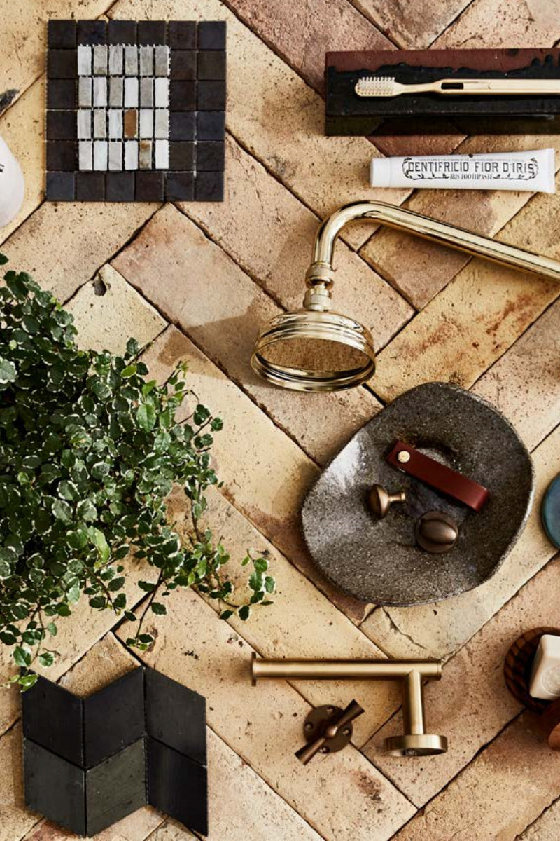ABOVE Clockwise from top left Fontia sandstone soap dispenser, Freedom. Rei Blanc glass mosaic tiles in Slate (light grey), Skheme. New Slate recycled-glass mosaic tiles,POA, Onsite Supply+Design. Decor Walther gold-plated toothbrush, Becker Minty. Handmade glazed brick, POA, Onsite Supply+Design. Santa Maria Novella ‘Iris’ toothpaste, Casa by Studio Kate. Oxford Lever shower setin PVD Brass (includes lever taps), Early Settler. Joseph Giles ‘Jesse II’ leather drawer pull, Frank Allart ‘Domed’ brass drawer knob, and ‘Crown’ brass cupboard knob, all The English Tapware Company. Flared ceramic dish, Casa by Studio Kate. Ogee tile, POA, Onsite Supply+Design. Santa Maria Novella ‘Melograno’ soap, Casa by Studio Kate. Huba wooden canister, Inartisan. Gareth Ashton brass toilet roll holder, Abey. Mariner’s Cleat drawer pull,The Society Inc. Chevron tiles in Khaki/Natural, Skheme. Hanging ficus from Mandalay Flowers. Malina terracotta tiles, POA, Gather Co.Tiling by Mustafa Tiler. LEFT From left Vessel entwined #2 artwork by Jo Young, Wagner Contemporary. Antique Chinese screen, Orient House. Tondo freestanding bath spout, and Elli II freestanding bath, both Parisi. Morgan & Finch bamboo bath caddy, Bed Bath N’Table. Antique Indonesian dingklik bench, Orient House. Devon cottonhand towel, Bed Bath N’Table. Soap and flared dish,as before. Swedish ivy from Mandalay Flowers. Vino accent table, Casa by Studio Kate. Metal- framed double doors (used as room divider), POA, Casa by Studio Kate. Tondo shower arm, and showerhead, Envy II wall mixers,and Tondohand shower,all Parisi. Antique Laotian rain drum,Orient House.Wall painted Stone Paint Coarse in Rubble, Porter’s Paints. Terracotta tiles as before.