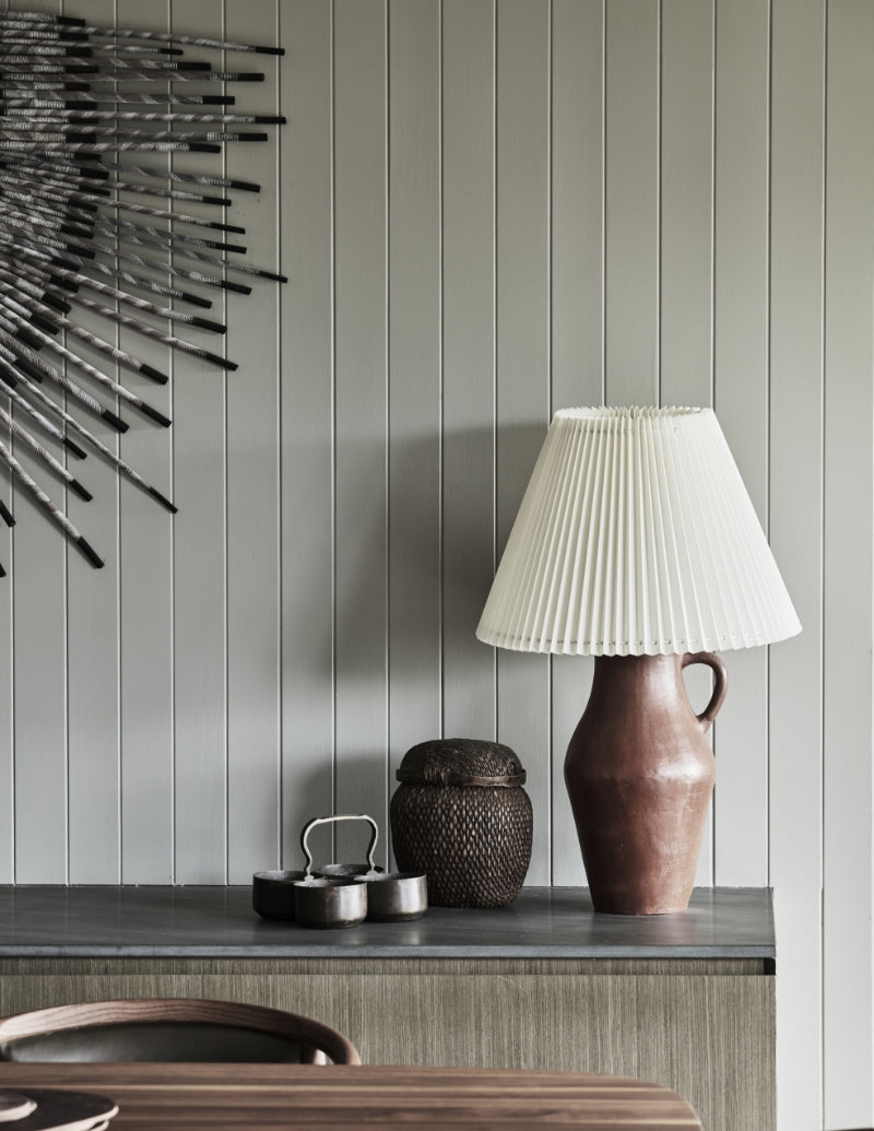 A table lamp is not just a source of illumination. It can form a sculptural element too, with both the base and shade adding shape and texture to a living room tableau. Wall sculpture by Tracey Deep.