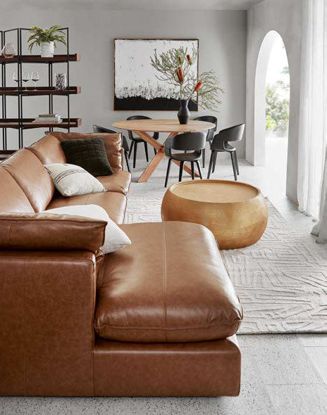 LEFT: The Sorrento modular sofa in Bendigo Tan leather and Hinterland artwork, both from Freedom, work well together.