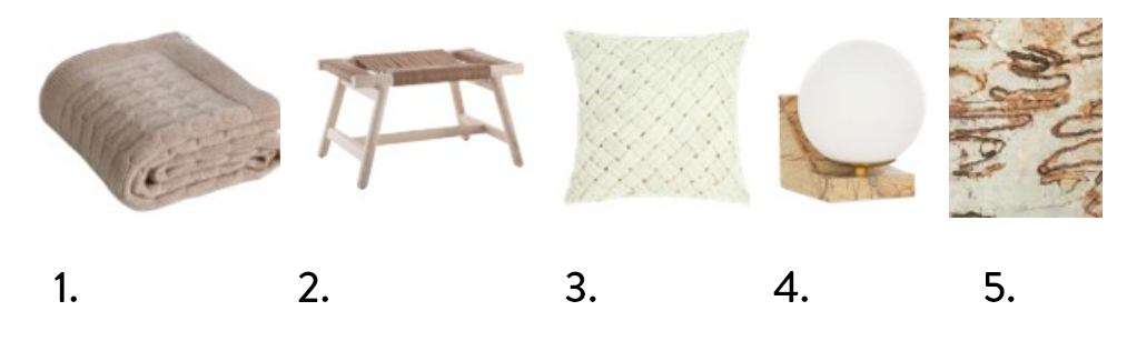 1Busatti braided cashmere throw in Camel (140x180cm), Casa by Kate Nixon; studiokate.com.au. 2 Flexform ‘Giano’ ottoman with cowhide cord seat by Antonio Citterio, Fanuli; fanuli.com.au. 3 Cora cotton cushion in Grey, Freedom;freedom.com.au. 4 Tillary desk lamp with stone base in Rainforest Brown, Coco Republic; cocorepublic.com.au. 5 Scribble hand-knotted wool, hemp and silk rug in Beige, Brown and Orange designed by Hare+Klein (240x300cm), Designer Rugs.