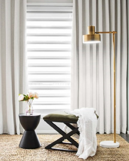 Pairing the fabric vanes of Luxaflex Window Fashions’ Pirouette shades with a floor-length curtain adds texture to a room.