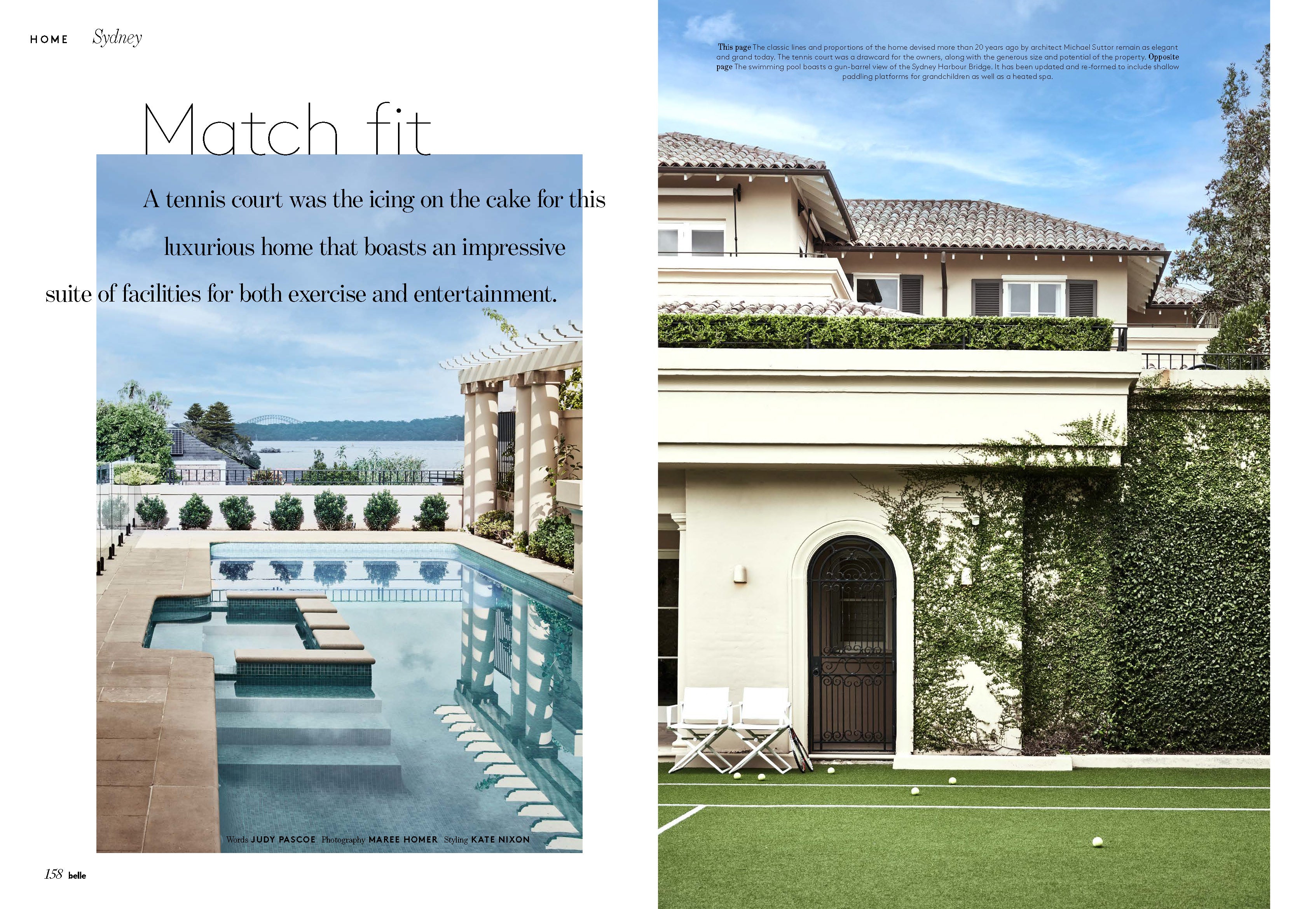 The classic lines and proportions of the home devised more than 20 years ago by architect Michael Suttor remain as elegant and grand today. The tennis court was a drawcard for the owners, along with the generous size and potential of the property. Opposite page The swimming pool boasts a gun-barrel view of the Sydney Harbour Bridge. It has been updated and re-formed to include shallow paddling platforms for grandchildren as well as a heated spa.