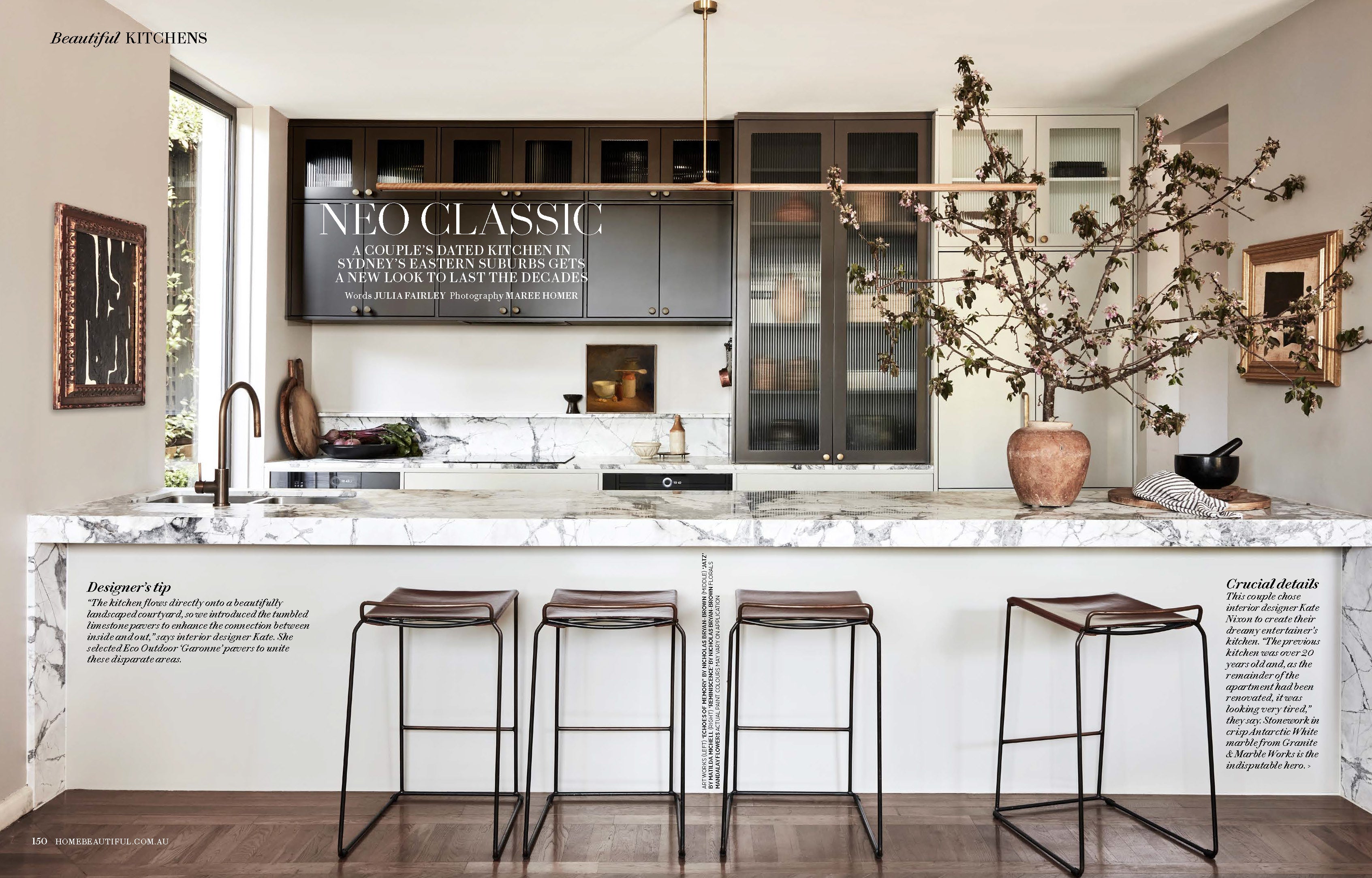 “The owners’ brief was to update and refresh the galley-style kitchen, opening it up to the adjacent living and dining spaces with modern appliances, smart storage, ambient lighting and a sit-up bench,”