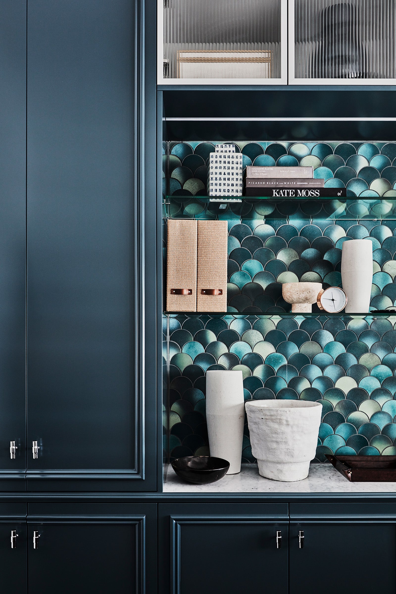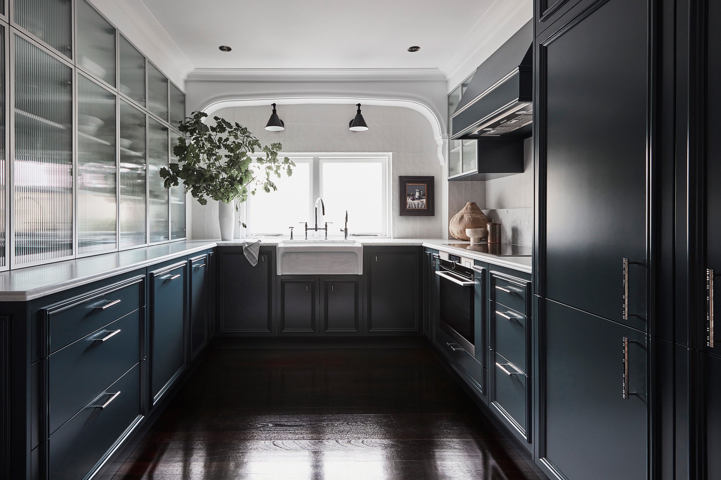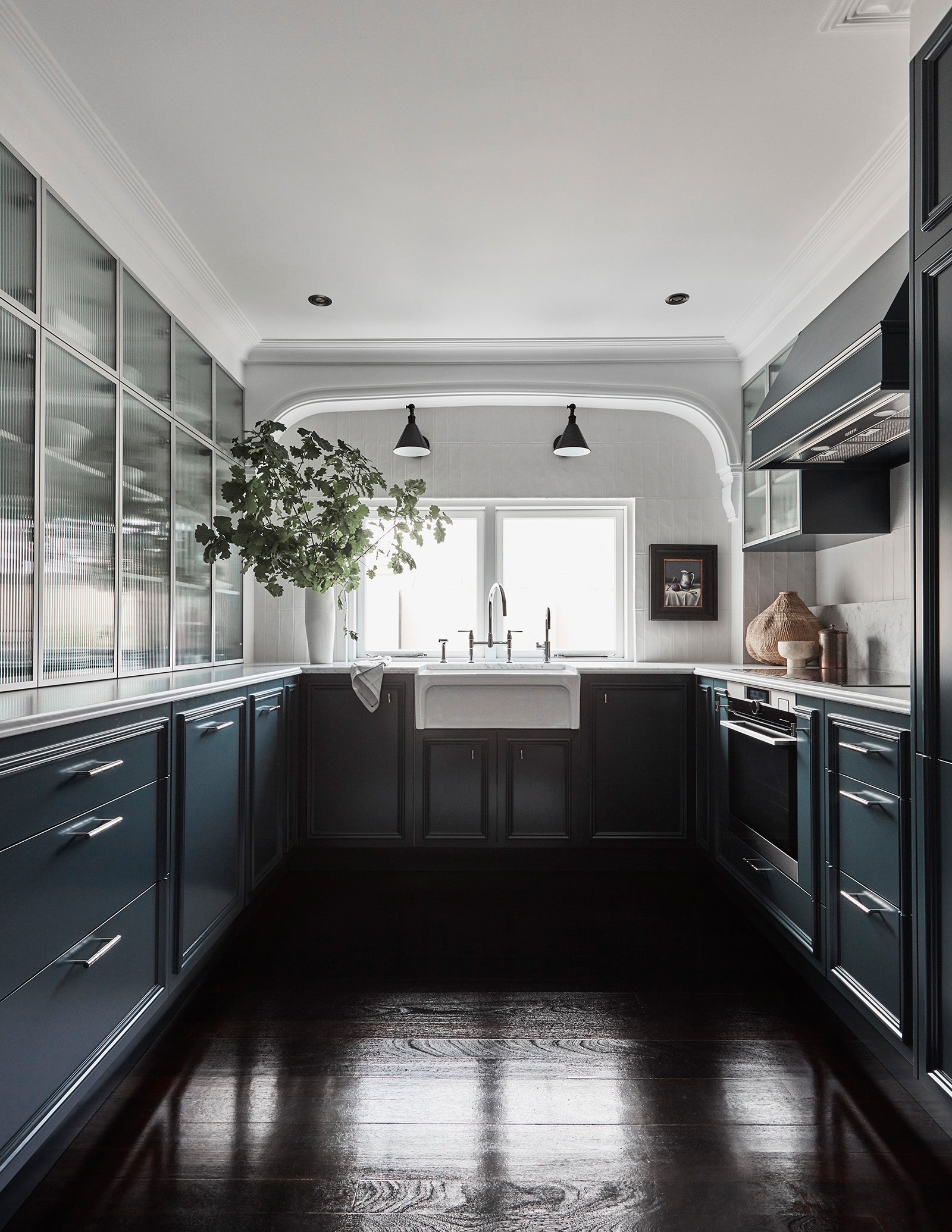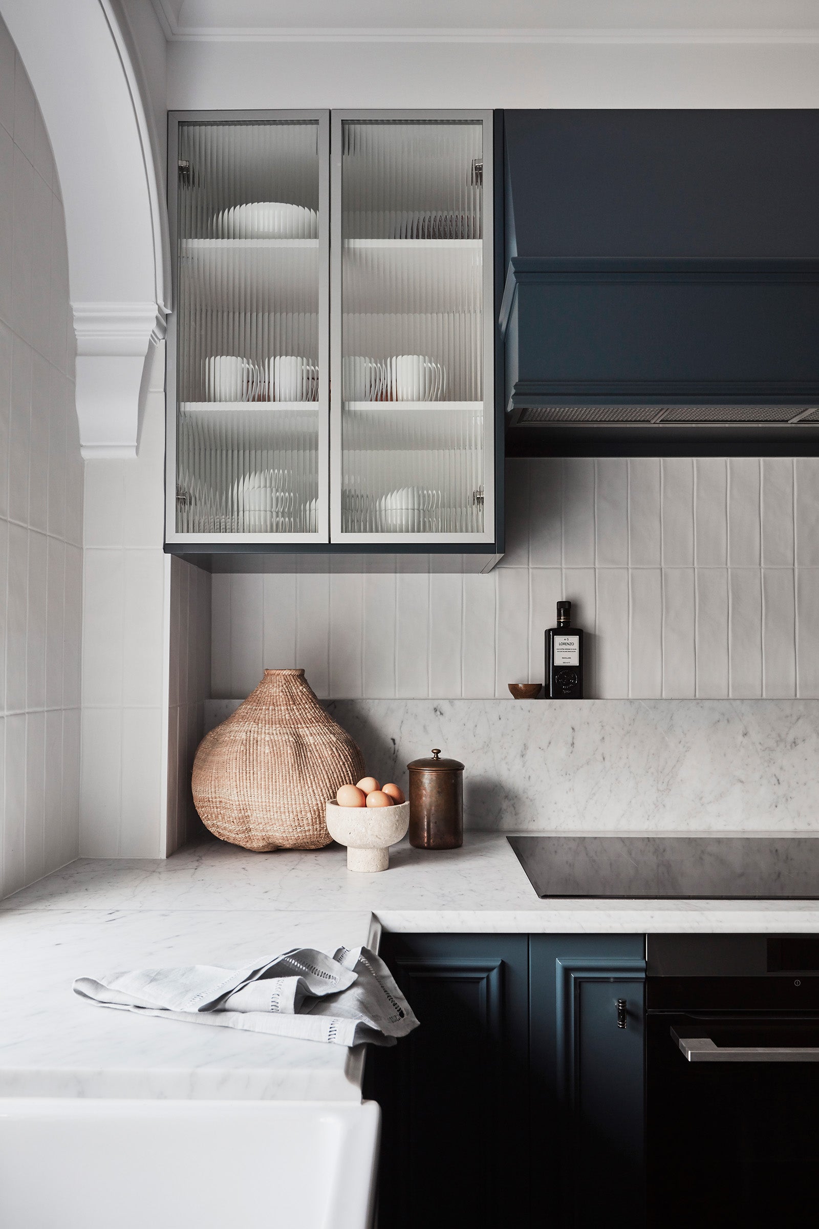 Drawing inspiration from the clients’ collection of contemporary art, teal cabinetry was introduced with statement tiles, timeless wall mouldings, fluted glass and classic Carrara marble. European sensibility for an Antipodean lifestyle.