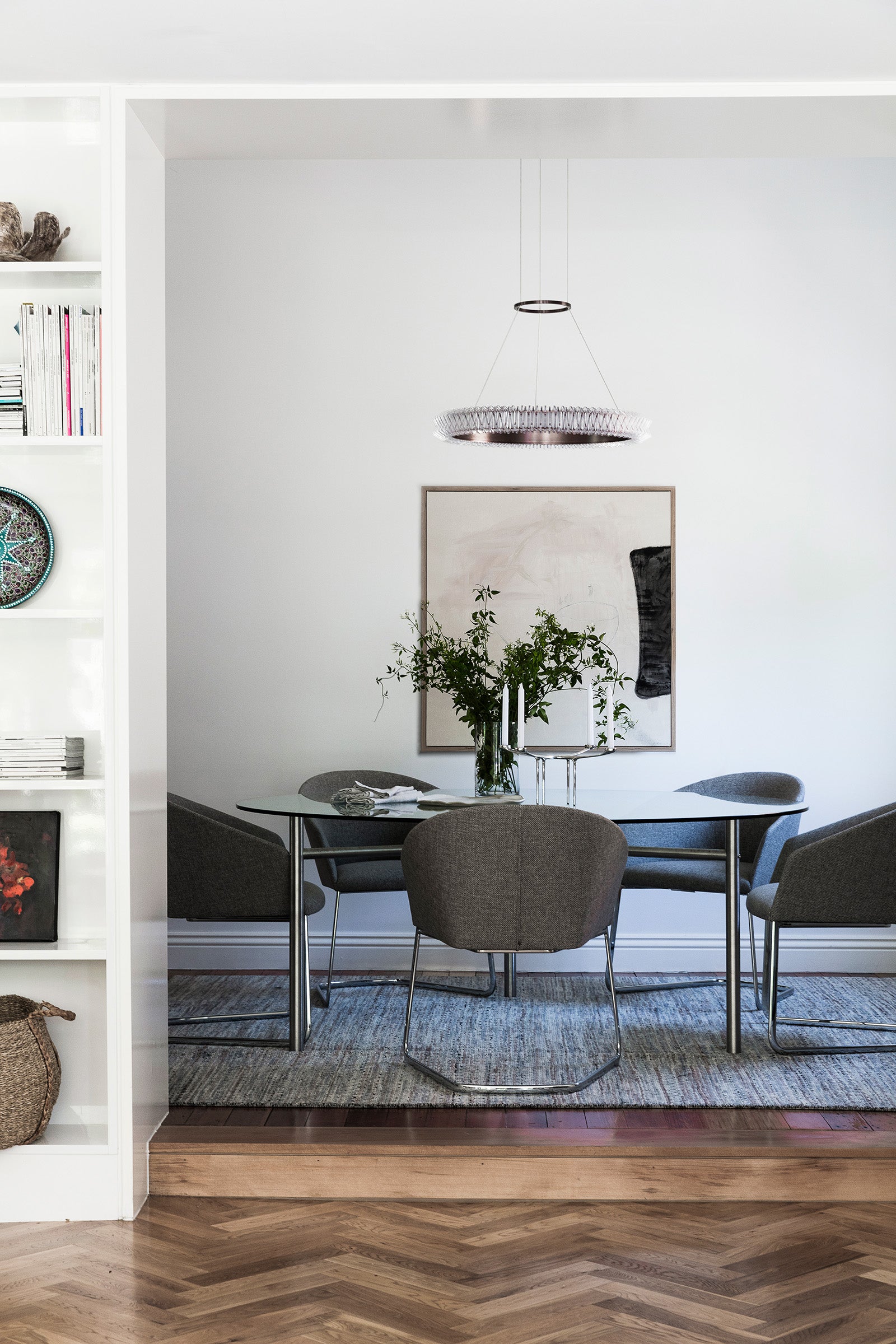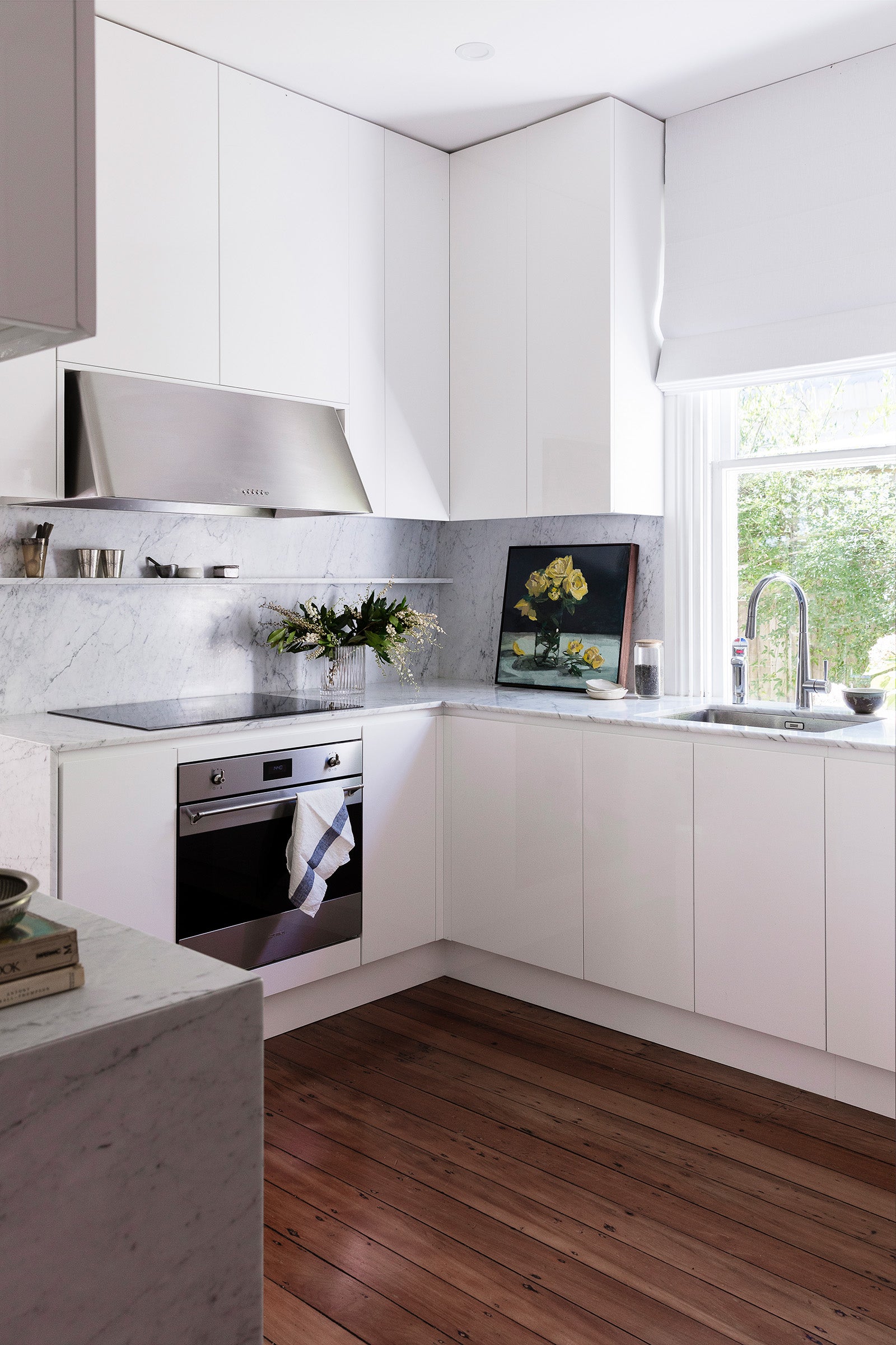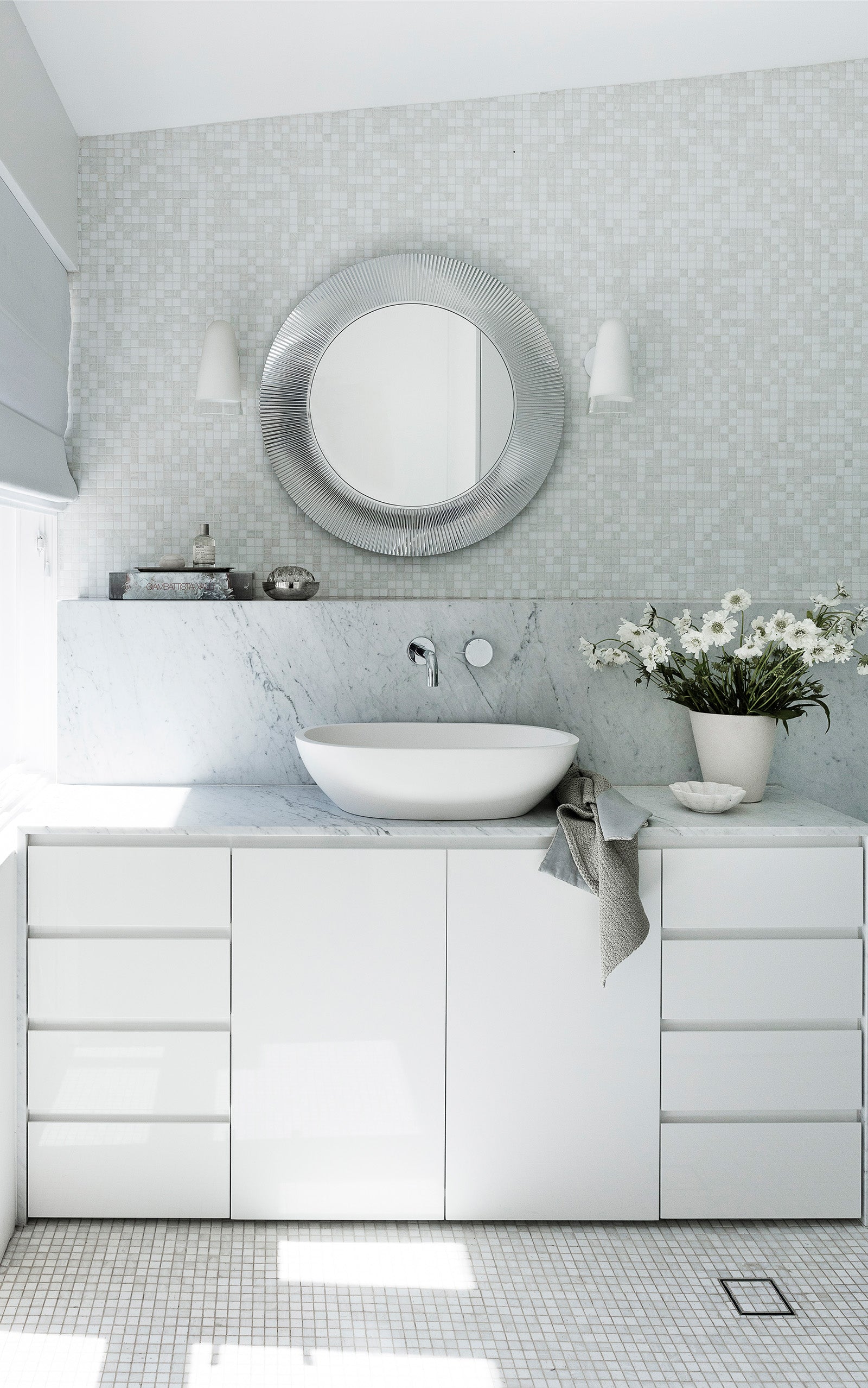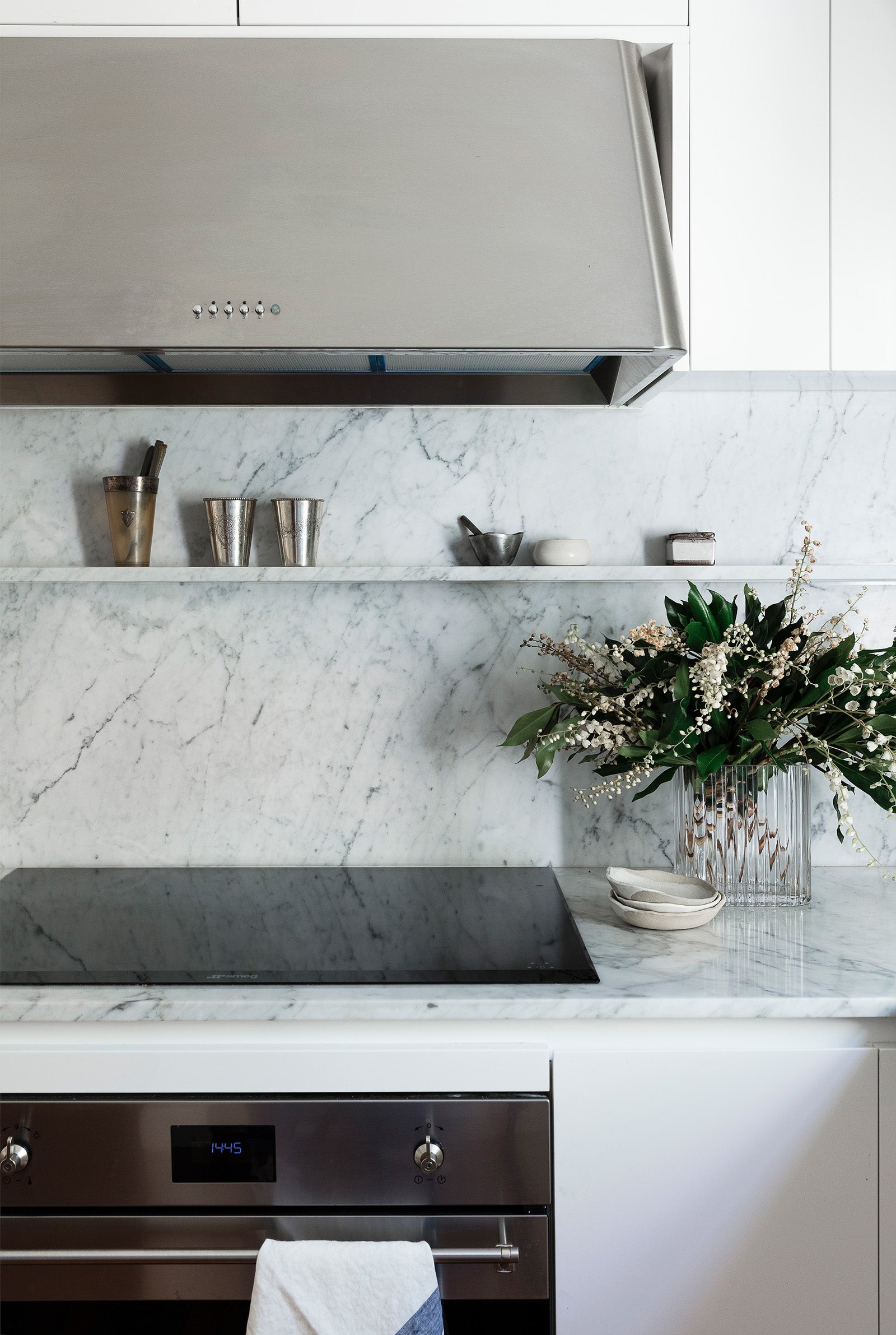 A clean, classic palette of solid timber floors, gloss white laminate joinery, Carrara marble and Bisazza mosaics delivers an elegant and timeless interior.