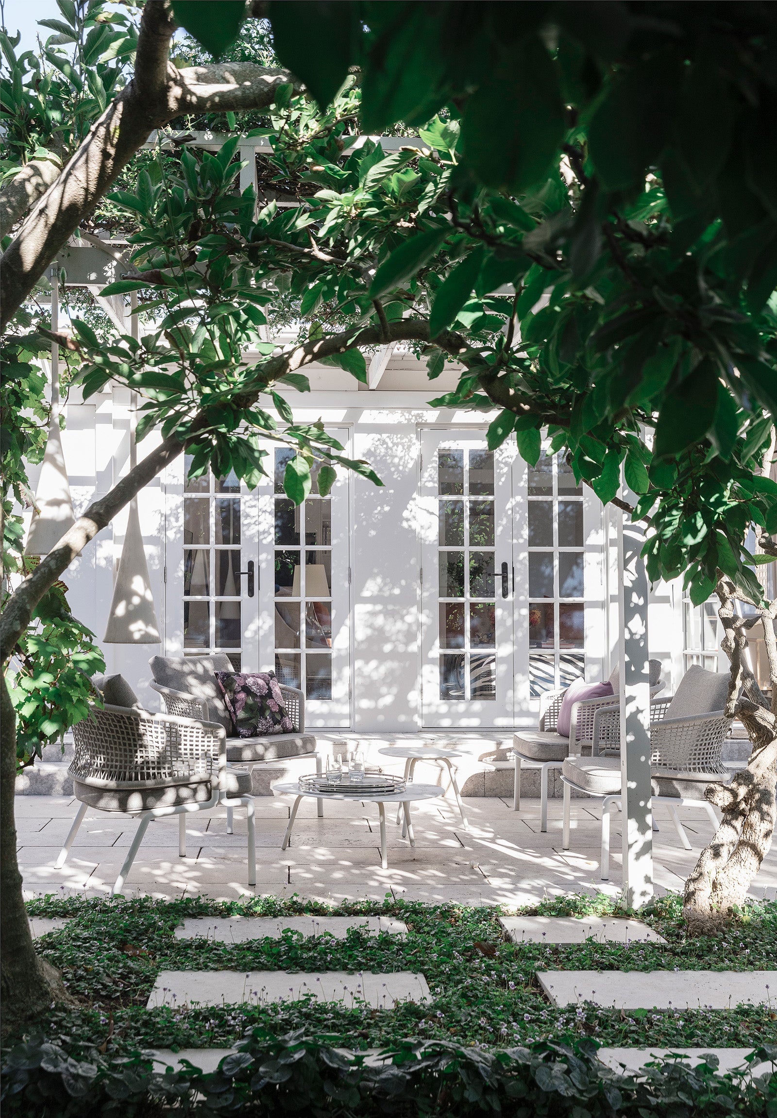 A complete front and rear garden design was integral to the interior renovation as the back of the house was opened with classic timber framed French doors to a newly paved entertaining terrace and green space. Floor to ceiling joinery was key in maximising the existing spaces and potential storage. Beams were added to the existing sloped ceiling to give a sense of architectural detailing, elevation and light.