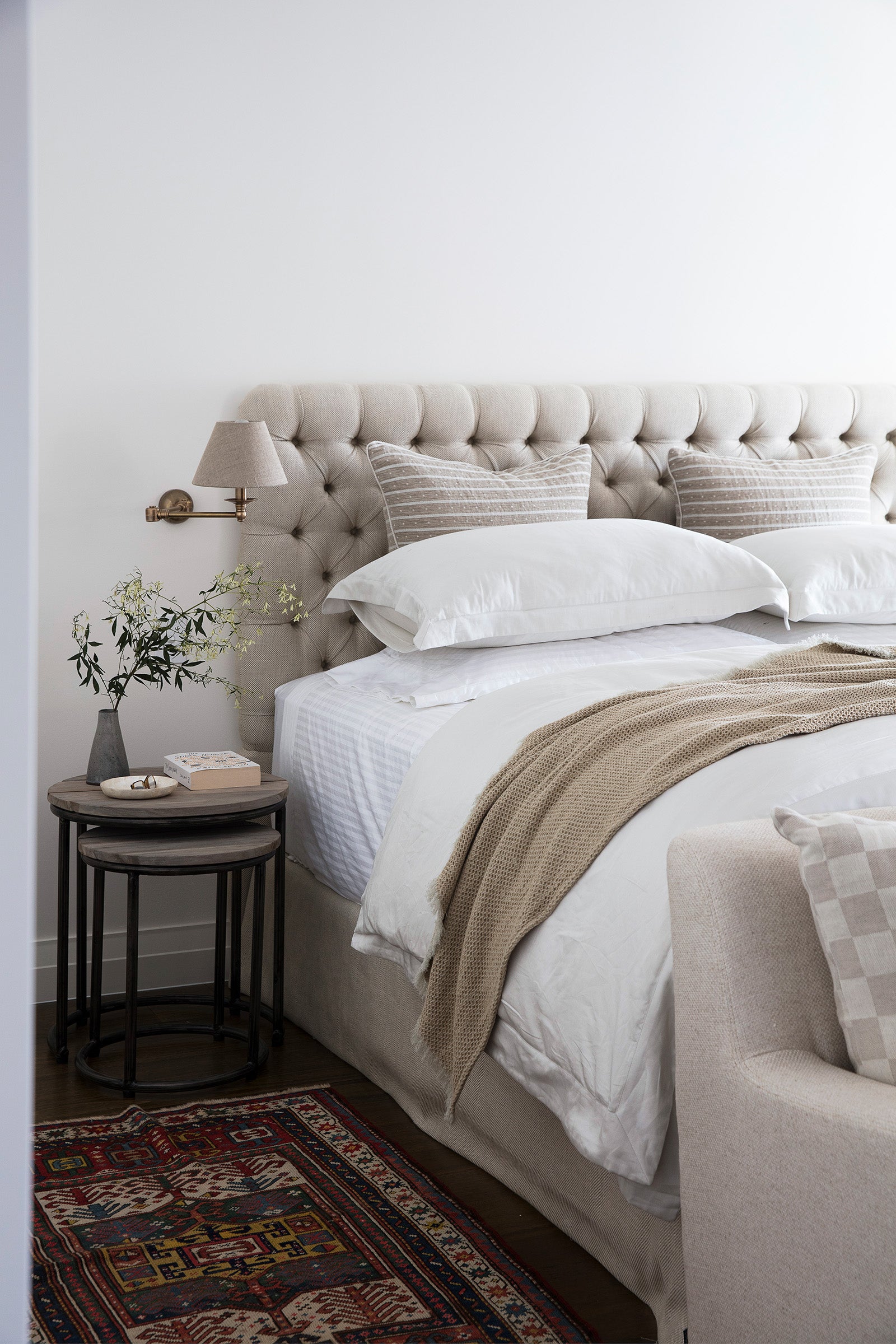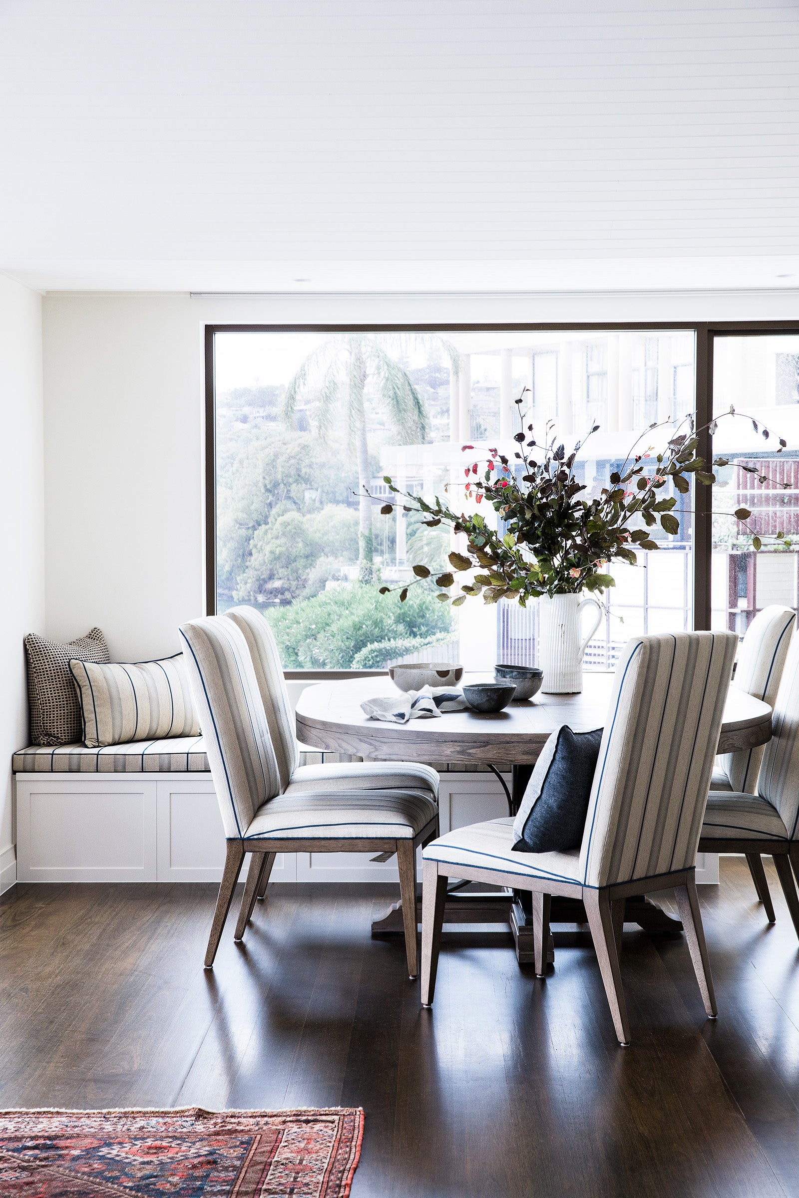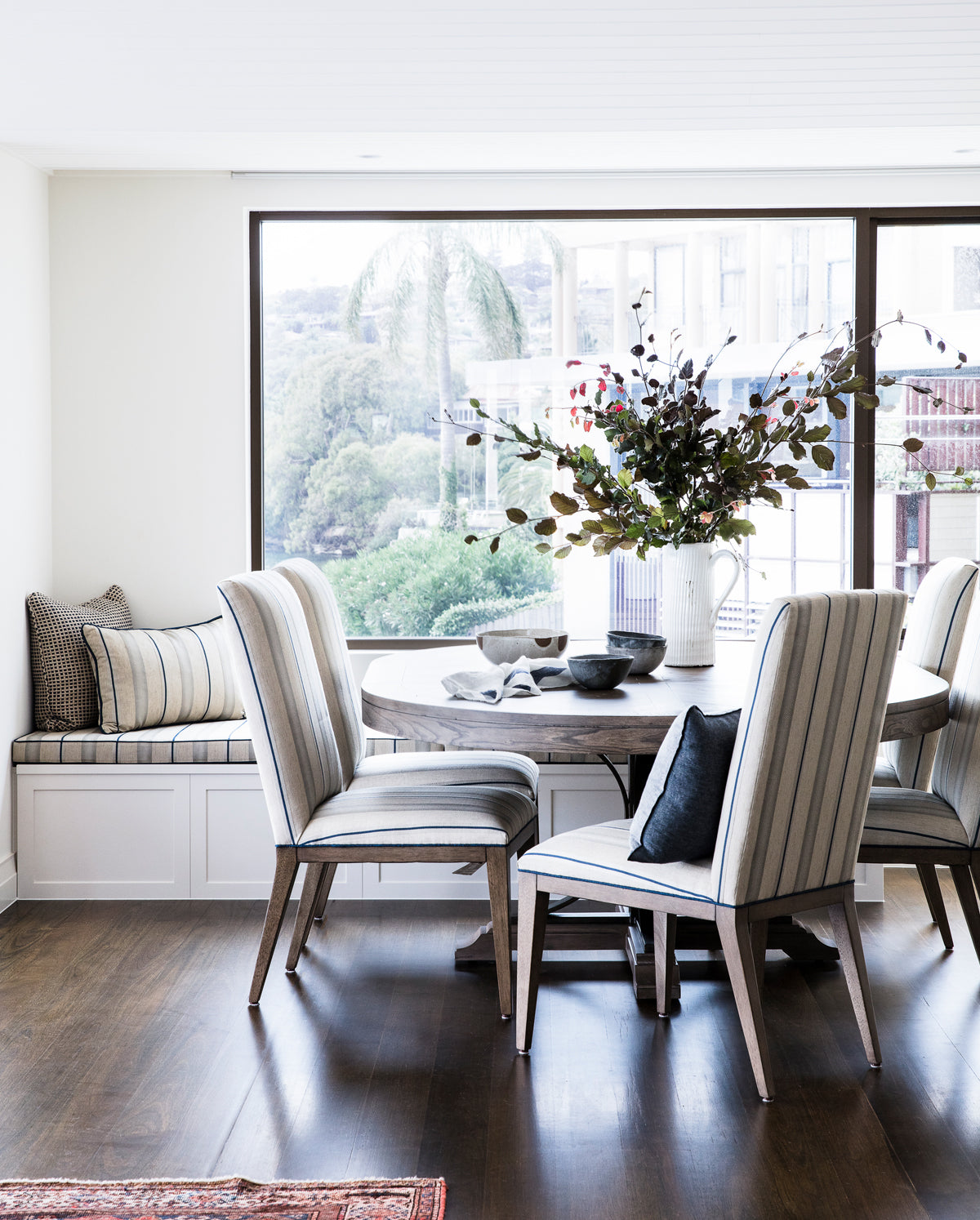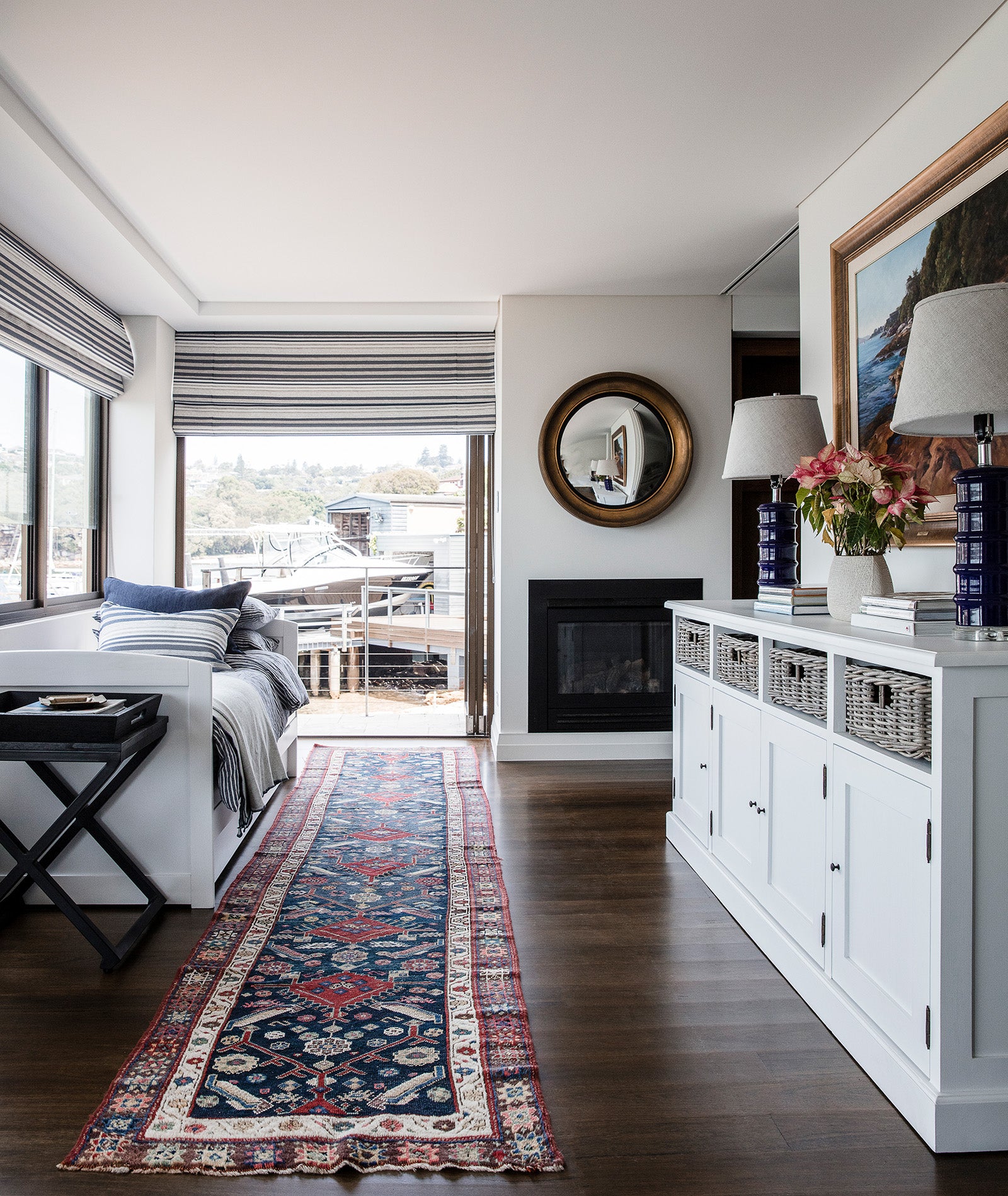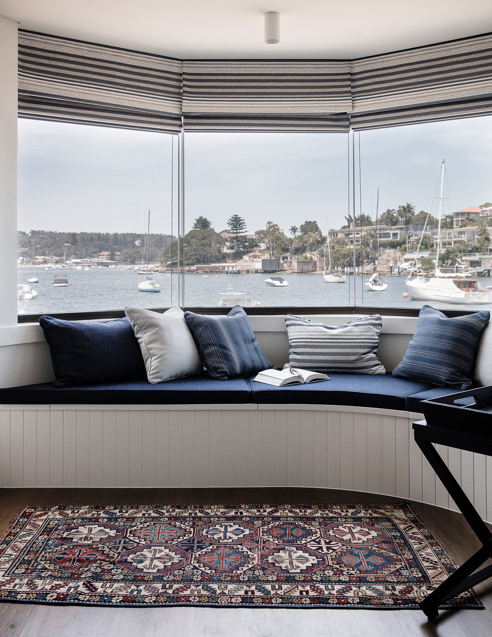 A considered palette of textured neutrals and nautically inspired stripes, natural timbers and wicker complement the client’s own collection of vintage carpets.