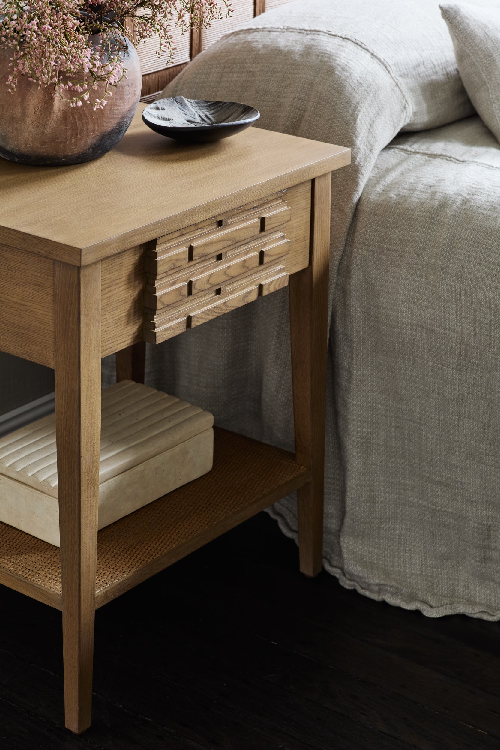 Barclay represents an esteemed career of seeking out the perfect side table. An elegantly tapered natural oak frame and hand-carved, soft close drawer balances tone and texture with practicality, proportion and enduring style. The inset woven cane shelf offers ample opportunities for stacks of books and magazines and reflects Kate’s love of layered textures and materiality.