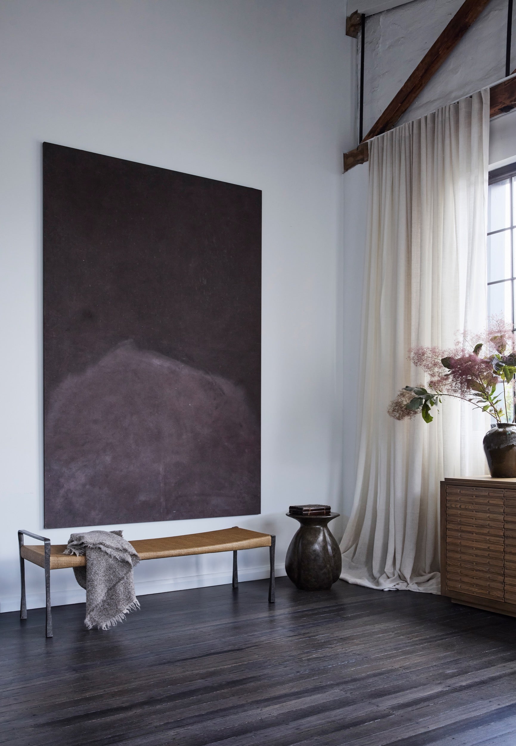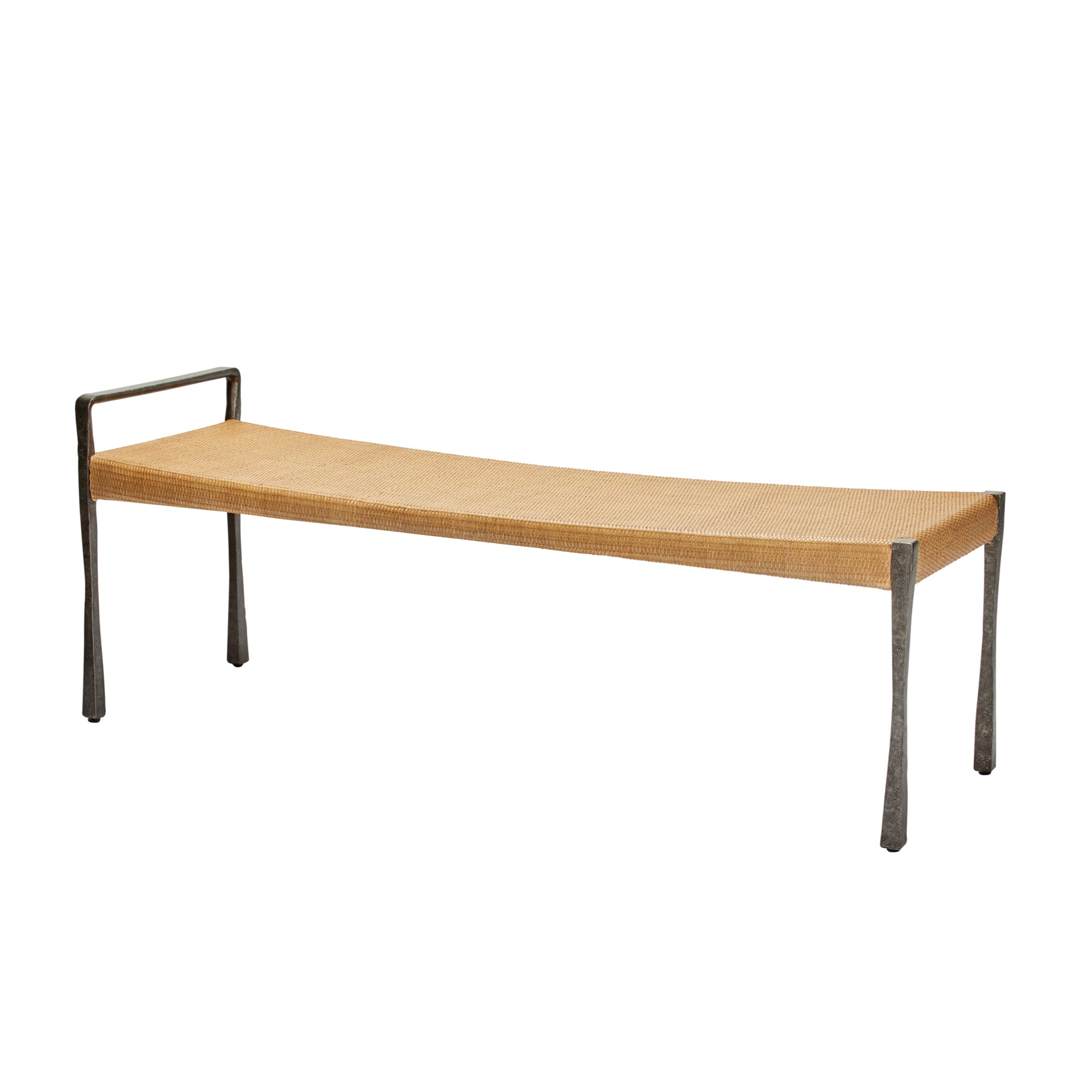 Thornton draws its inspiration from hammered steel and wrapped cane with its asymmetrical sculptured metal frame and subtly curved woven seat. This is a piece imagined for every room, designed to sit comfortably with baskets beneath and artwork above in an elegant entry, paired with upholstered seating in a layered living room, footnoting a bed or paired with