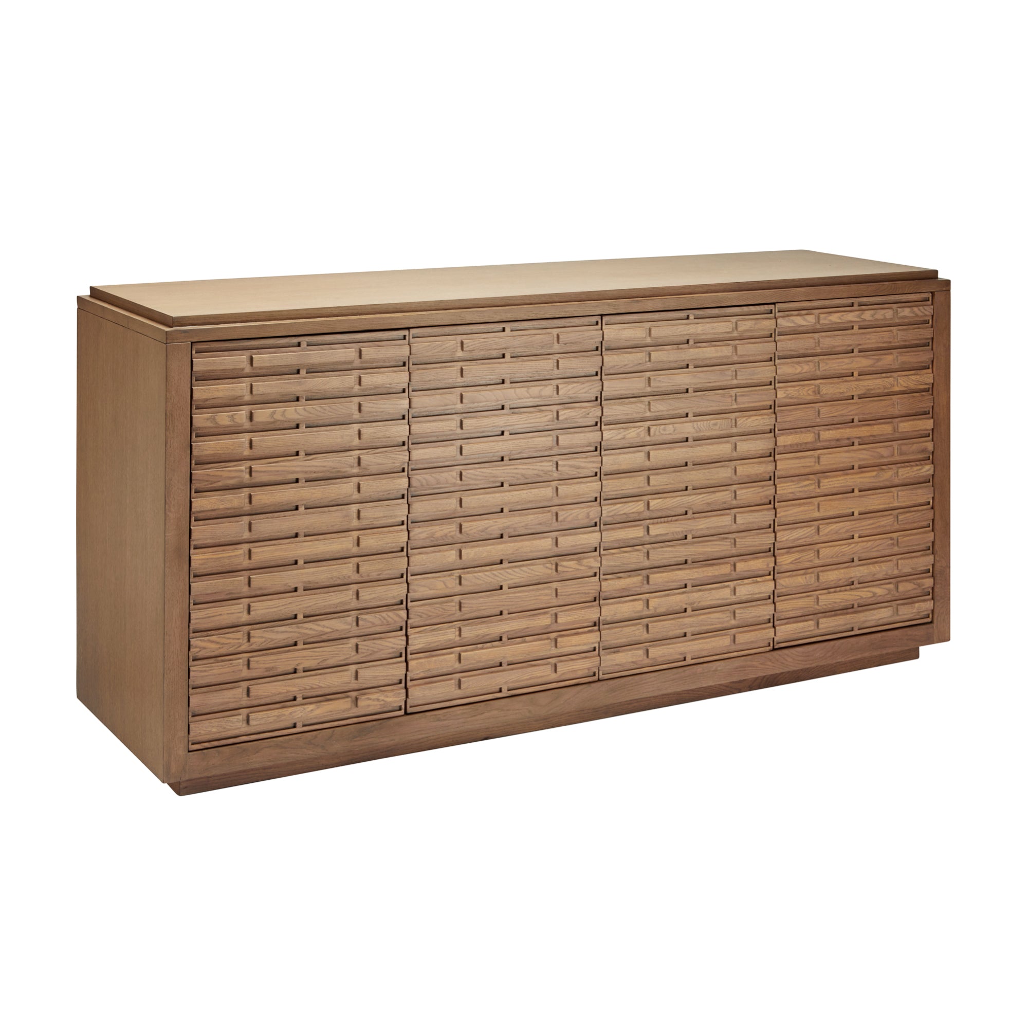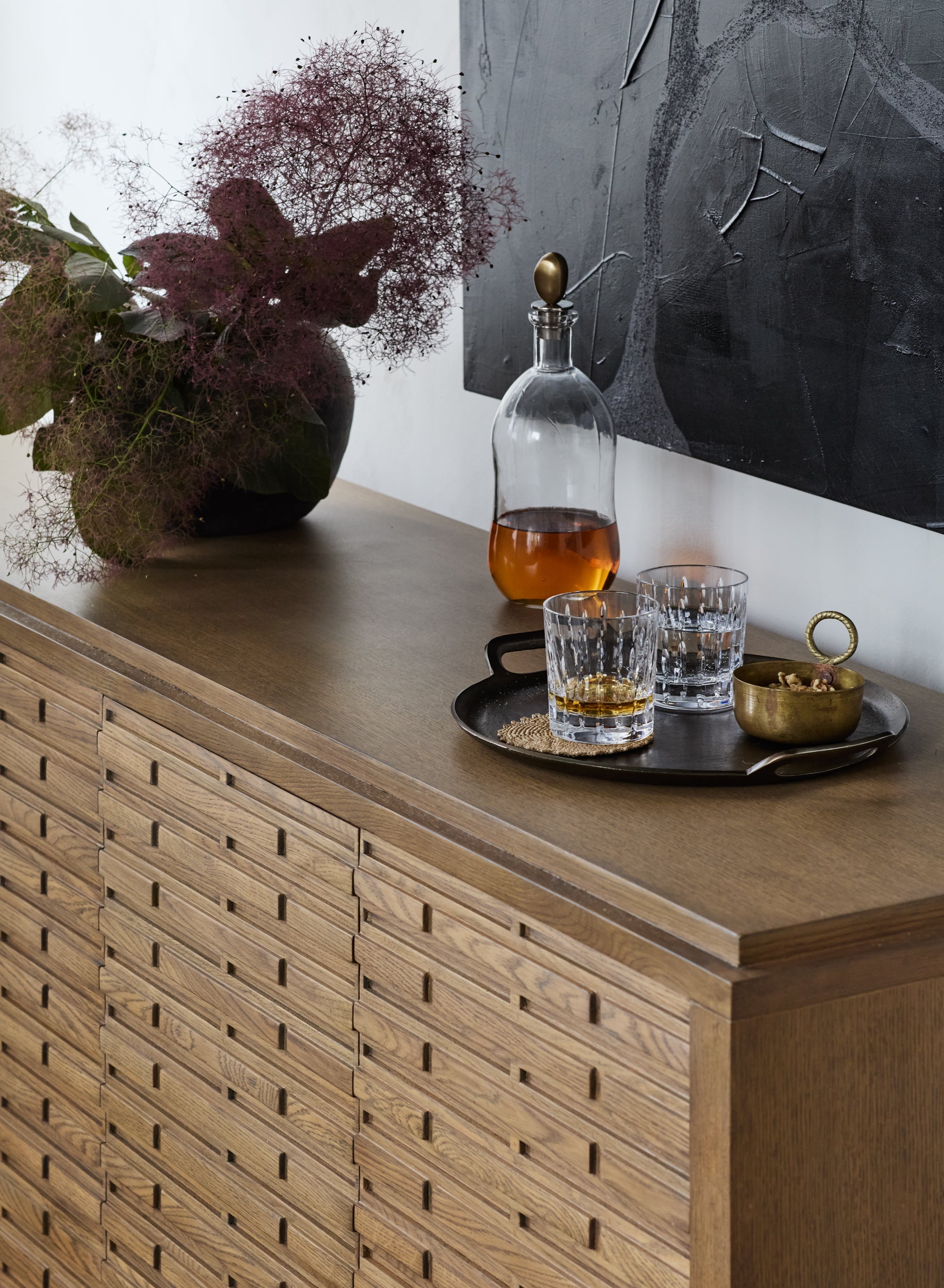 Wingham brings practical storage and versatility to this classic case goods, sideboard staple. Intricate hand carved oak detailing elevates its timeless proportions and a combination of internal soft close drawers, open shelves and ventilation offers versatility as a media unit, entry piece, dining or living room sideboard or generous bedroom chest.