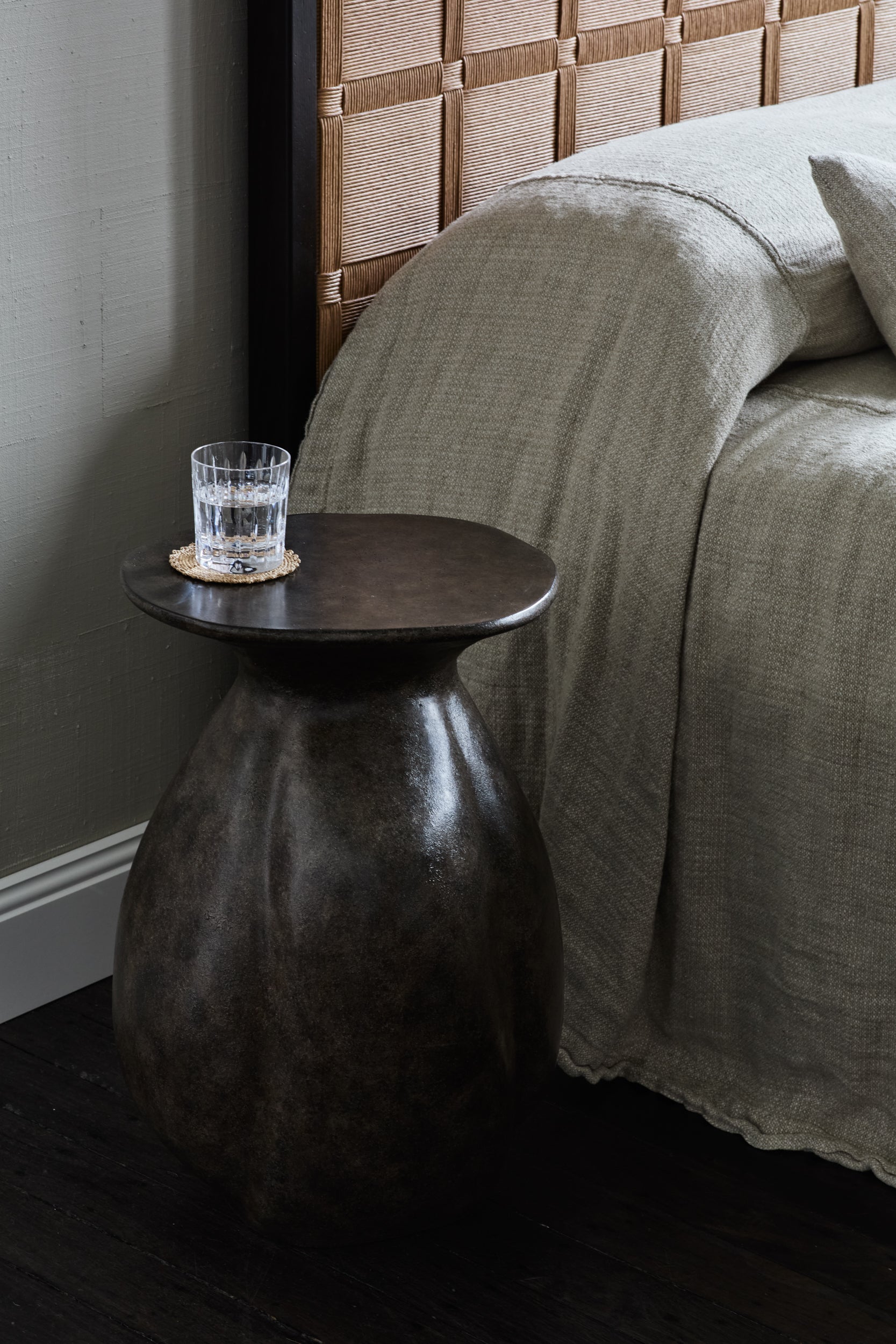 Humphrey presents a characterful homage to cast resin and sculptural forms, hand carved from solid timber then cast and finished in a smooth, antique buff. A layering of individual markings brings depth and whimsy to this lovely side table, its practical proportions accommodating a multitude of circumstances and settings.