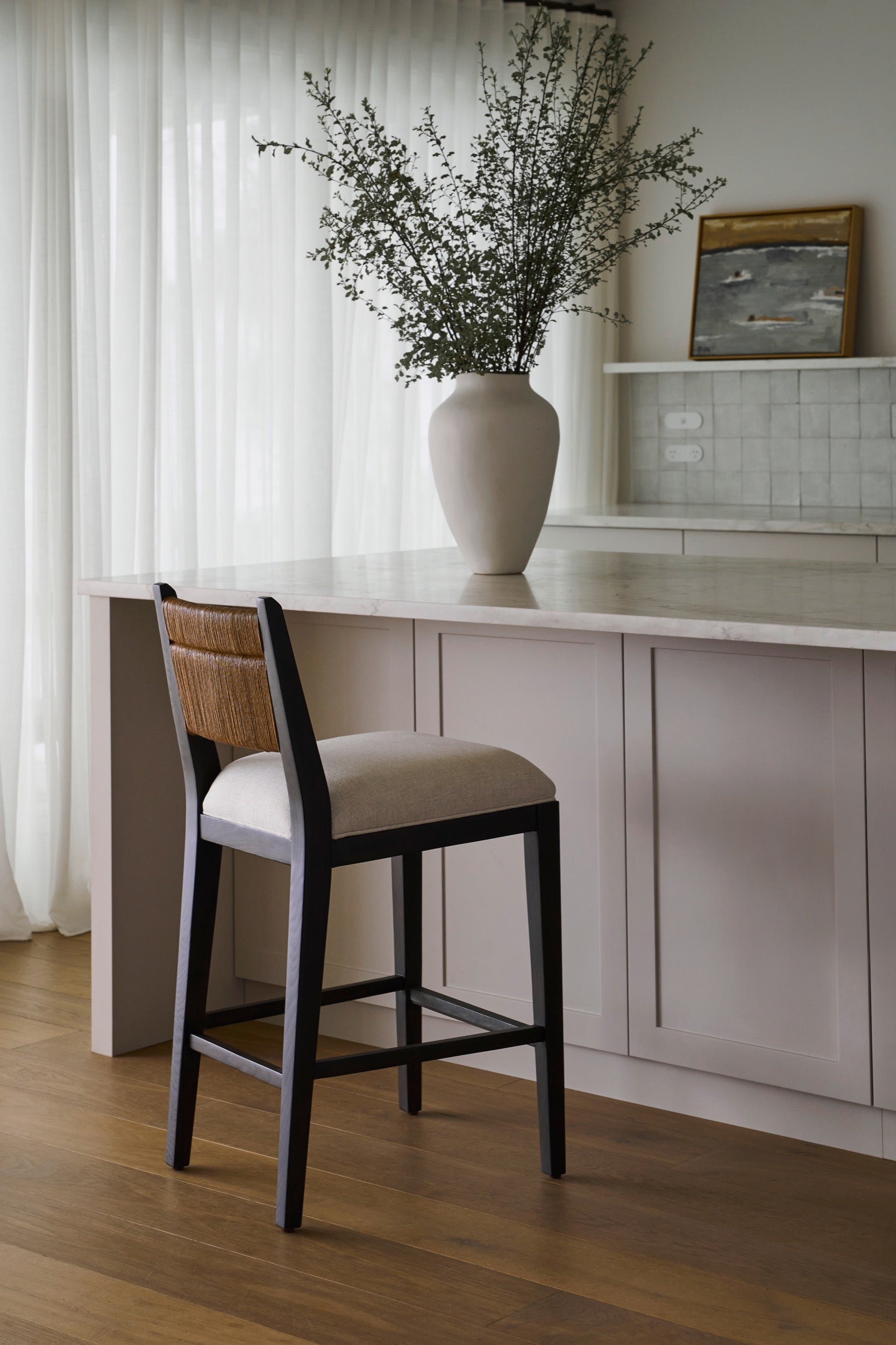 Bennett reflects a confident, structured character that is both fresh and familiar. The solid mahogany base and stained oak frame pairs an elegant, tapered profile with comfortable seat upholstery and a handwoven Danish papercord back rest, further softened with a padded fabric lumbar cushion looped to the timber side posts. A brass footrest completes the delightful attention to detail.